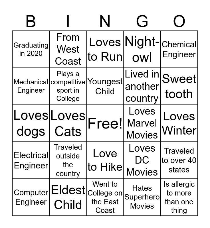 This bingo card has a free space and 31 words: Went to College on the East Coast, From Kansas City, Loves Cats, Previous Honeywell intern, Graduating in 2020, Loves to Run, Plays a competitive sport in College, Loves DC Movies, Loves Marvel Movies, Hates Superhero Movies, Loves Winter, Is allergic to more than one thing, Civil Engineer, Morning Bird, Sweet tooth, Goes to the Gym often, Traveled to over 40 states, Traveled outside the country, Electrical Engineer, Love to Hike, Chemical Engineer, Wears contacts, Computer Engineer, From West Coast, Lived in another country, Mechanical Engineer, Night-owl, Loves dogs, Eldest Child, Youngest Child and Only Child.