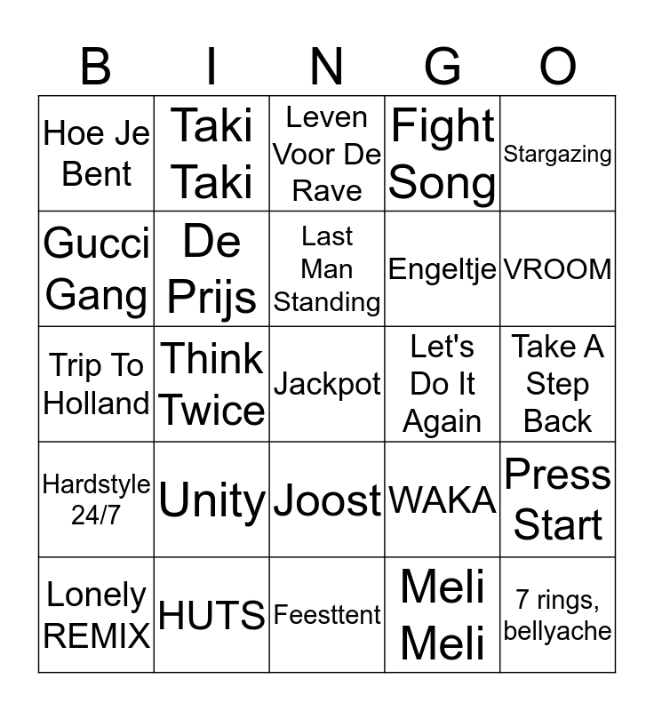 This bingo card has 62 words: Swingo, HUTS, Miljonair, Hardstyle 24/7, 7 rings, bellyache, bury a friend, De Prijs, DRUP, Engeltje, Ewa Ewa, Fight Song, Fireball, Gucci Gang, Happier, Het Is Stil Aan De Overkant, Hoe Je Bent, Jackpot, Stargazing, Laat Me, Last Man Standing, Let's Do It Again, Leven Voor De Rave, Lonely REMIX, Meli Meli, Natural, Ode To The Godfather, Perfect, Potentie, Press Start, Rise Up, SAD!, Side Effects, Side To Side, Some Nights fun, Take A Step Back, Taki Taki, Take on Me, The Middle, Think Twice, This Is Me, Trip To Holland, Tripaloski, Unity, Links Rechts, VROOM, WAKA, Battle! Xerneas / Yveltal / Zygarde, Gas Op Die Lollie, Cowboys en Indianen, Het Vliegerlied, Joost, Feesttent, 10.000 Luchtballonnen, Sexy Als Ik Dans, Duurt Te Lang, Barbie Girl, Oya lélé, MaMaSé!, Hakuna Matata, Shower, Uptown Funk and Het Is Weer Weekend.
