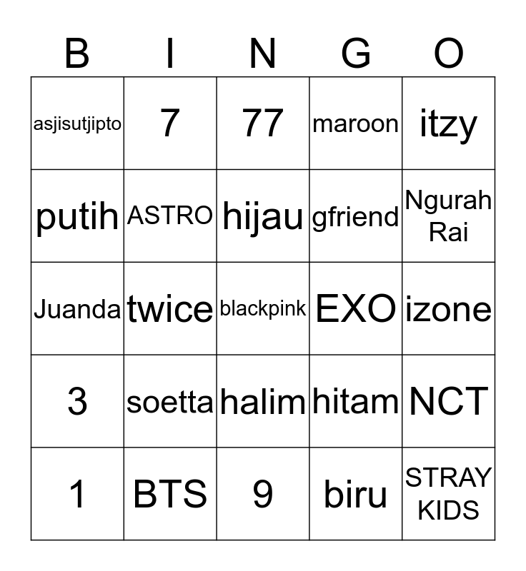 This bingo card has a free space and 24 words: soetta, BTS, hijau, 1, itzy, asjisutjipto, putih, 7, EXO, halim, gfriend, Juanda, hitam, NCT, ASTRO, biru, izone, 77, Ngurah Rai, twice, STRAY KIDS, 3, maroon and 9.