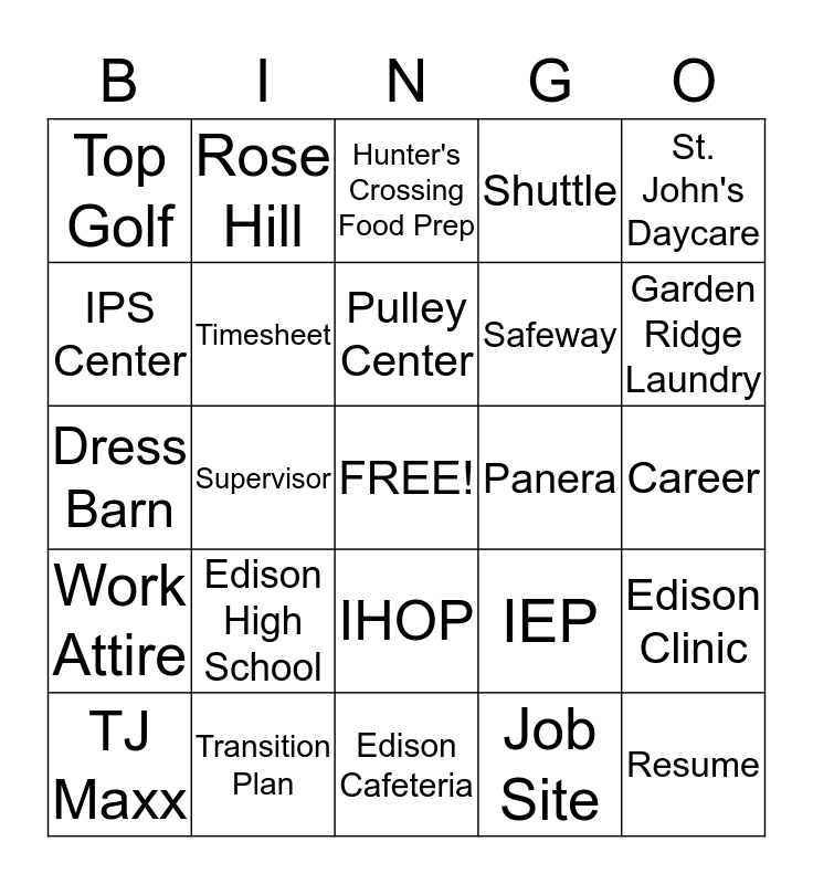 This bingo card has a free space and 24 words: Edison High School, Transition Plan, Pulley Center, TJ Maxx, St. John's Daycare, Top Golf, IPS Center, Rose Hill, Panera, IHOP, Safeway, Dress Barn, IEP, Edison Clinic, Timesheet, Job Site, Career, Hunter's Crossing Food Prep, Garden Ridge Laundry, Supervisor, Resume, Work Attire, Shuttle and Edison Cafeteria.