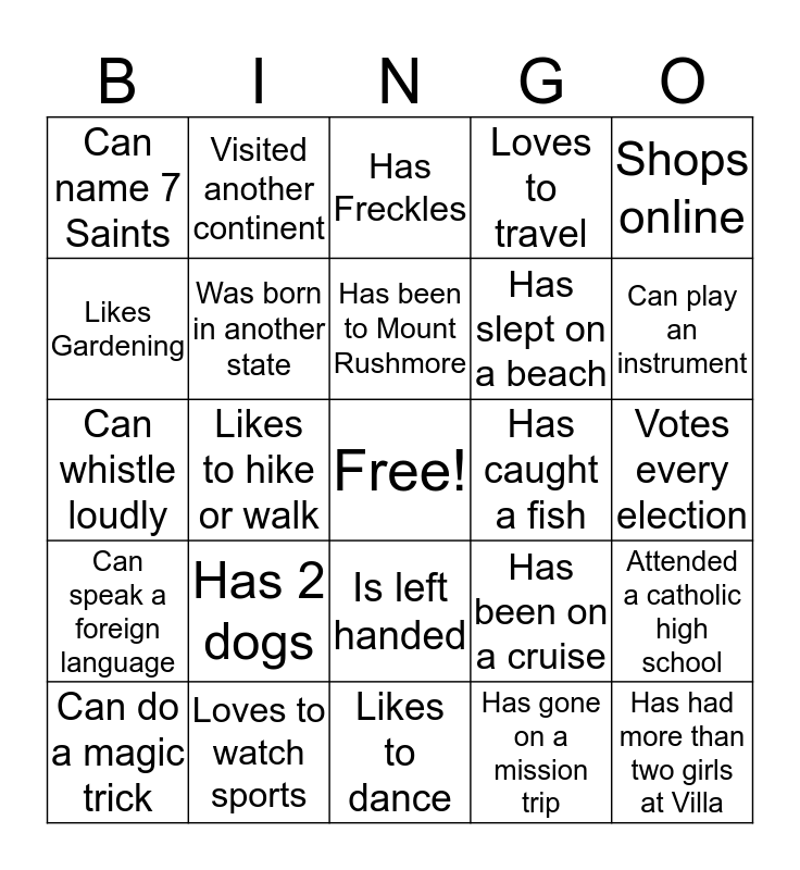 This bingo card has a free space and 24 words: Has 2 dogs, Loves to watch sports, Has been to Mount Rushmore, Can do a magic trick, Shops online, Can name 7 Saints, Likes Gardening, Visited another continent, Has caught a fish, Is left handed, Has slept on a beach, Can whistle loudly, Has been on a cruise, Attended a catholic high school, Was born in another state, Has gone on a mission trip, Votes every election, Has Freckles, Can play an instrument, Likes to hike or walk, Has had more than two girls at Villa, Can speak a foreign language, Loves to travel and Likes to dance.