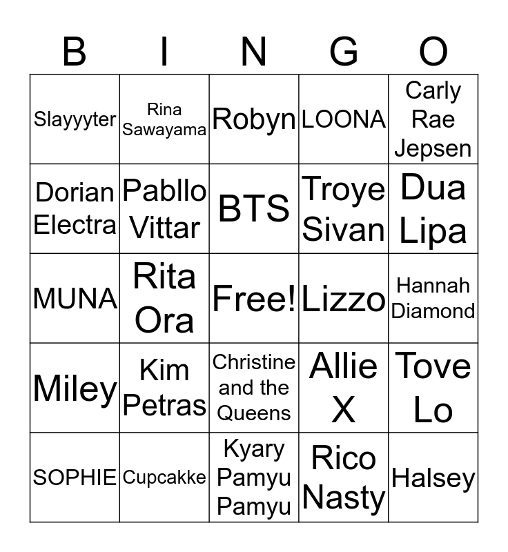 This bingo card has a free space and 24 words: Kim Petras, Cupcakke, BTS, SOPHIE, Carly Rae Jepsen, Slayyyter, Dorian Electra, Rina Sawayama, Lizzo, Christine and the Queens, Troye Sivan, MUNA, Allie X, Tove Lo, Pabllo Vittar, Rico Nasty, Hannah Diamond, Robyn, Dua Lipa, Rita Ora, Halsey, Miley, LOONA and Kyary Pamyu Pamyu.