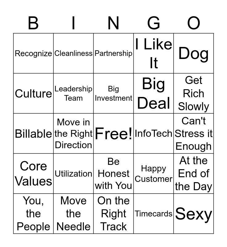 This bingo card has a free space and 24 words: Utilization, Move the Needle, Big Investment, You, the People, Dog, Recognize, Culture, Cleanliness, InfoTech, Be Honest with You, Big Deal, Billable, Happy Customer, At the End of the Day, Leadership Team, Timecards, Can't Stress it Enough, Partnership, Get Rich Slowly, Move in the Right Direction, Sexy, Core Values, I Like It and On the Right Track.