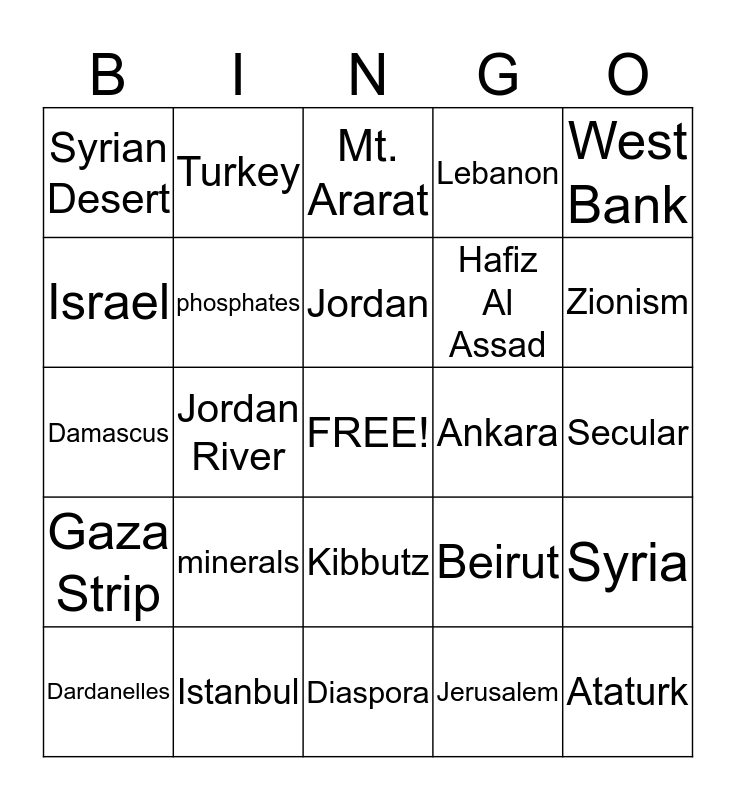 This bingo card has a free space and 29 words: Dardanelles, Bosporus, Jordan River, Dead Sea, Syrian Desert, Mt. Ararat, phosphates, minerals, Ankara, Istanbul, Secular, Ataturk, Diaspora, Jerusalem, Zionism, kosher, Kibbutz, Gaza Strip, West Bank, Damascus, Beirut, Bedouins, Hafiz Al Assad, Israel, Lebanon, Turkey, Syria, Jordan and Cyprus.