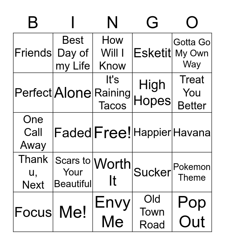 This bingo card has a free space and 29 words: Focus, Juice, Faded, Seven Nation Army, Friends, How Will I Know, Alone, Scars to Your Beautiful, Happier, Me!, Havana, Pop Out, Envy Me, Old Town Road, Treat You Better, Someone Like You, Worth It, Thank u, Next, Gotta Go My Own Way, One Call Away, Sucker, Dancing with a Stranger, High Hopes, Perfect, Esketit, Best Day of my Life, Pokemon Theme, It's Raining Tacos and Uptown Funk.