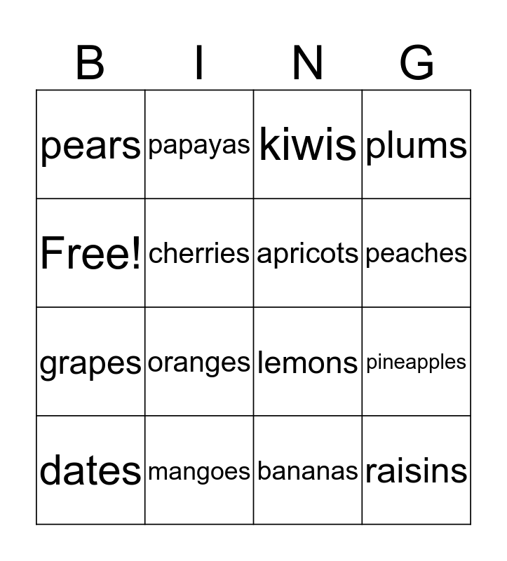 This bingo card has 16 words: mangoes, pineapples, kiwis, pears, grapes, papayas, lemons, bananas, Free!, cherries, dates, plums, oranges, peaches, apricots and raisins.