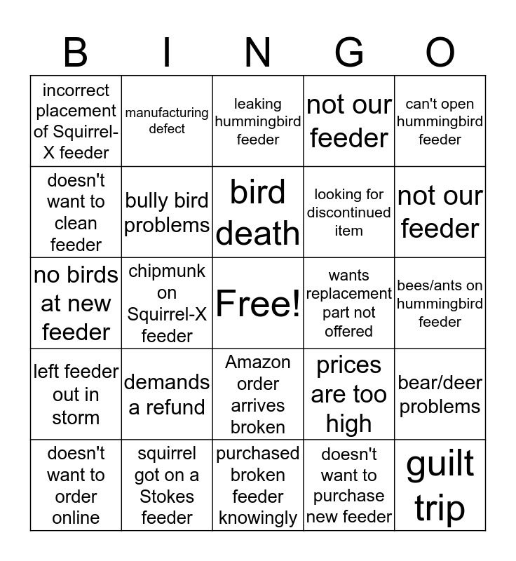 This bingo card has a free space and 24 words: demands a refund, squirrel got on a Stokes feeder, bird death, doesn't want to order online, can't open hummingbird feeder, incorrect placement of Squirrel-X feeder, doesn't want to clean feeder, manufacturing defect, wants replacement part not offered, Amazon order arrives broken, looking for discontinued item, no birds at new feeder, prices are too high, bear/deer problems, bully bird problems, doesn't want to purchase new feeder, bees/ants on hummingbird feeder, leaking hummingbird feeder, not our feeder, chipmunk on Squirrel-X feeder, guilt trip, left feeder out in storm, not our feeder and purchased broken feeder knowingly.