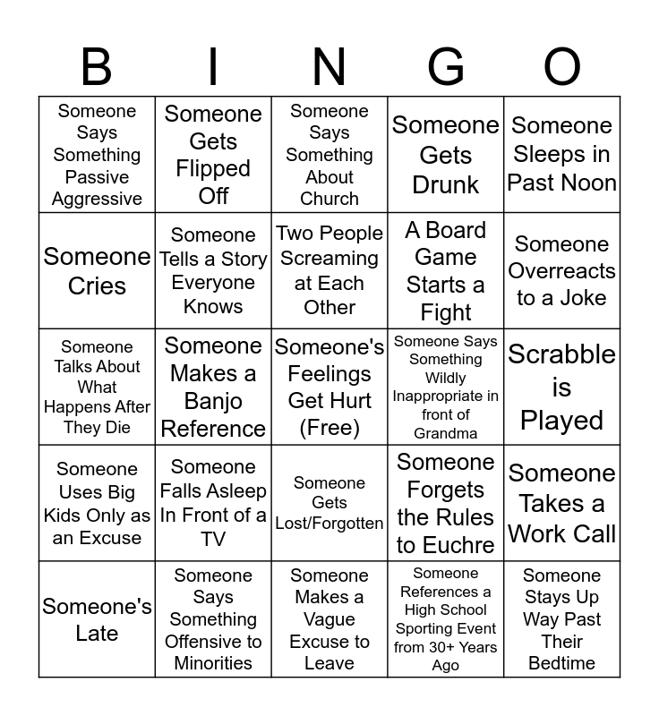 This bingo card has a free space and 24 words: Someone Falls Asleep In Front of a TV, Someone Says Something Offensive to Minorities, Two People Screaming at Each Other, Someone's Late, Someone Sleeps in Past Noon, Someone Says Something Passive Aggressive, Someone Cries, Someone Gets Flipped Off, Someone Says Something Wildly Inappropriate in front of Grandma, Someone Gets Lost/Forgotten, A Board Game Starts a Fight, Someone Talks About What Happens After They Die, Someone Forgets the Rules to Euchre, Someone Takes a Work Call, Someone Tells a Story Everyone Knows, Someone References a High School Sporting Event from 30+ Years Ago, Scrabble is Played, Someone Says Something About Church, Someone Overreacts to a Joke, Someone Makes a Banjo Reference, Someone Stays Up Way Past Their Bedtime, Someone Uses Big Kids Only as an Excuse, Someone Gets Drunk and Someone Makes a Vague Excuse to Leave.