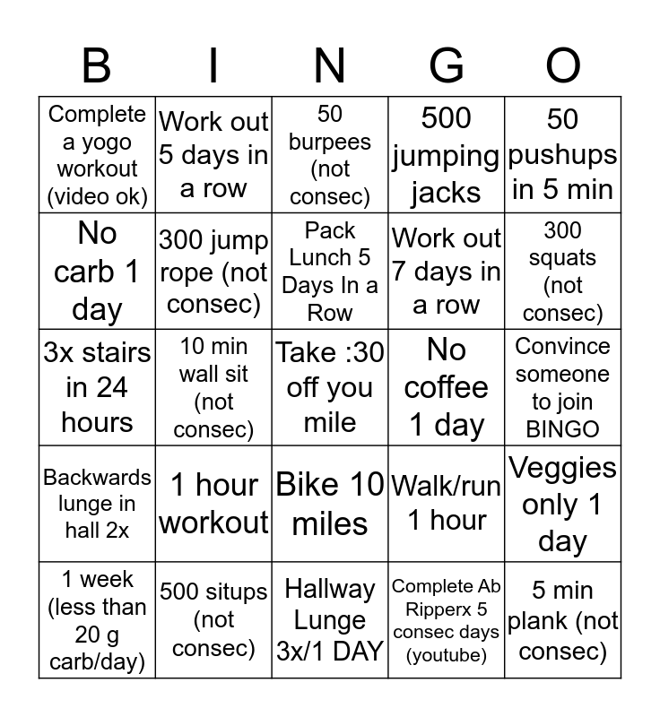 This bingo card has 25 words: 1 hour workout, Hallway Lunge 3x/1 DAY, Pack Lunch 5 Days In a Row, 1 week (less than 20 g carb/day), 50 pushups in 5 min, Complete a yogo workout (video ok), No carb 1 day, Work out 5 days in a row, No coffee 1 day, Bike 10 miles, Work out 7 days in a row, 3x stairs in 24 hours, Walk/run 1 hour, Veggies only 1 day, 300 jump rope (not consec), 5 min plank (not consec), Convince someone to join BINGO, 50 burpees (not consec), 300 squats (not consec), 10 min wall sit (not consec), Take :30 off you mile, 500 situps (not consec), Backwards lunge in hall 2x, 500 jumping jacks and Complete Ab Ripperx 5 consec days (youtube).