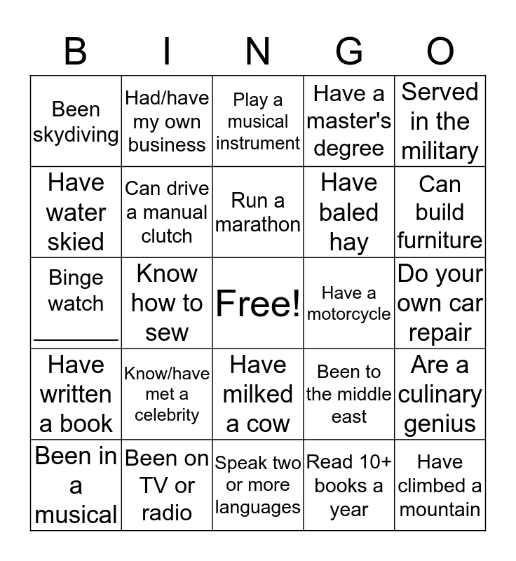 This bingo card has a free space and 24 words: Know/have met a celebrity, Been on TV or radio, Run a marathon, Been in a musical, Served in the military, Been skydiving, Have water skied, Had/have my own business, Have a motorcycle, Have milked a cow, Have baled hay, Binge watch _______, Been to the middle east, Are a culinary genius, Can drive a manual clutch, Read 10+ books a year, Do your own car repair, Play a musical instrument, Can build furniture, Know how to sew, Have climbed a mountain, Have written a book, Have a master's degree and Speak two or more languages.