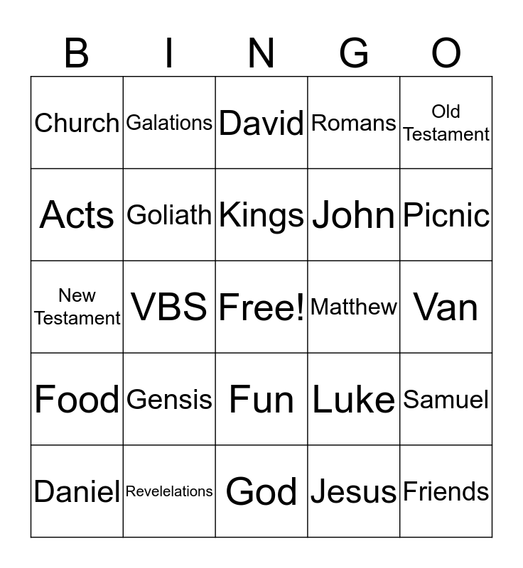 This bingo card has a free space and 29 words: Daniel, Lions Den, VBS, Dublin Street, Church, David, Goliath, Gensis, Matthew, Revelelations, Van, Friends, God, Jesus, Picnic, Bible, Fun, Food, Old Testament, New Testament, Luke, Mark, John, Acts, Romans, Galations, Samuel, Kings and Proverbs.