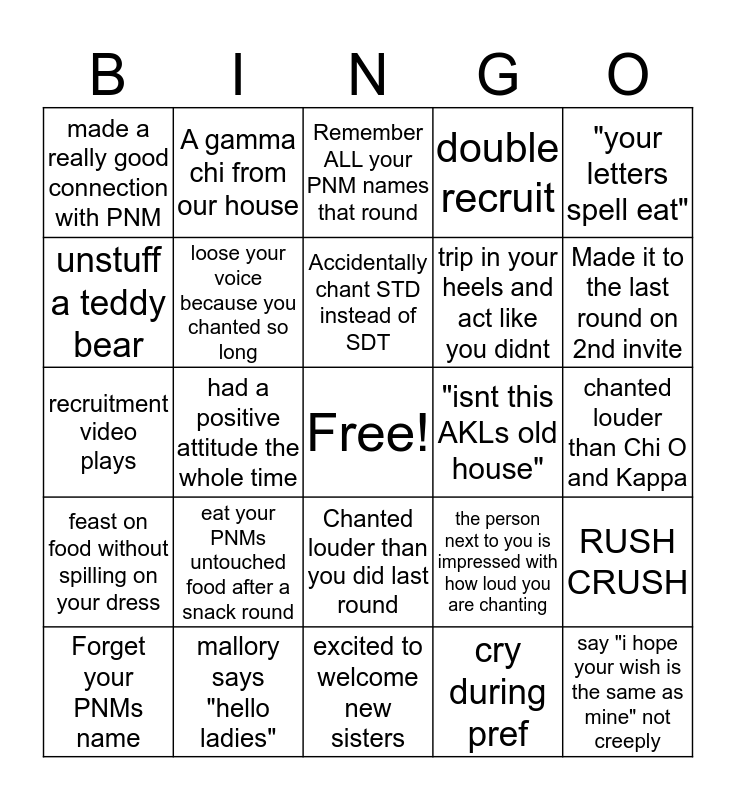 This bingo card has a free space and 24 words: eat your PNMs untouched food after a snack round, mallory says "hello ladies", Accidentally chant STD instead of SDT, Forget your PNMs name, "your letters spell eat", made a really good connection with PNM, unstuff a teddy bear, A gamma chi from our house, "isnt this AKLs old house", Chanted louder than you did last round, trip in your heels and act like you didnt, recruitment video plays, the person next to you is impressed with how loud you are chanting, RUSH CRUSH, loose your voice because you chanted so long, cry during pref, chanted louder than Chi O and Kappa, Remember ALL your PNM names that round, Made it to the last round on 2nd invite, had a positive attitude the whole time, say "i hope your wish is the same as mine" not creeply, feast on food without spilling on your dress, double recruit and excited to welcome new sisters.