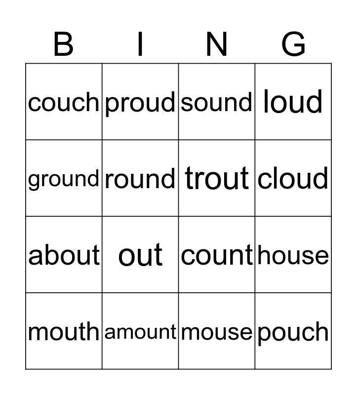 This bingo card has 20 words: mouth, shout, sound, house, south, out, mouse, loud, about, proud, count, cloud, couch, amount, trout, our, ground, round, found and pouch.