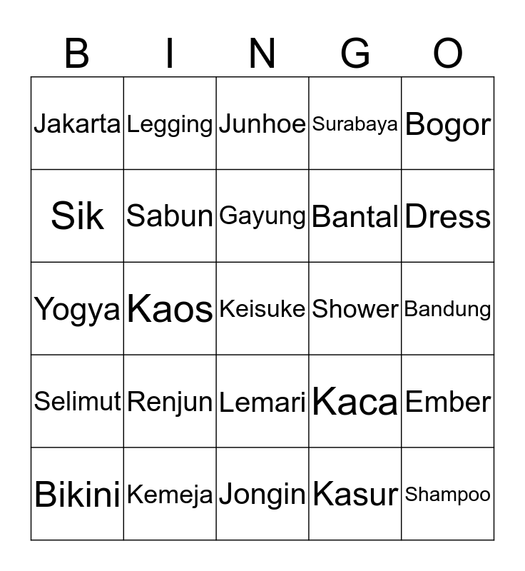 This bingo card has a free space and 24 words: Renjun, Kemeja, Gayung, Bikini, Bogor, Jakarta, Sik, Legging, Shower, Lemari, Bantal, Yogya, Kaca, Ember, Sabun, Kasur, Bandung, Junhoe, Dress, Kaos, Shampoo, Selimut, Surabaya and Jongin.