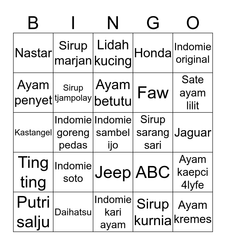 This bingo card has a free space and 24 words: Indomie soto, Daihatsu, Ayam betutu, Putri salju, Indomie original, Nastar, Ayam penyet, Sirup marjan, Sirup sarang sari, Jeep, Faw, Kastangel, ABC, Ayam kaepci 4lyfe, Sirup tjampolay, Sirup kurnia, Jaguar, Lidah kucing, Sate ayam lilit, Indomie goreng pedas, Ayam kremes, Ting ting, Honda and Indomie kari ayam.