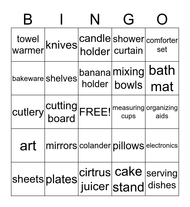 This bingo card has a free space and 24 words: mirrors, plates, banana holder, sheets, comforter set, towel warmer, bakeware, knives, measuring cups, colander, mixing bowls, cutlery, pillows, electronics, shelves, cake stand, organizing aids, candle holder, bath mat, cutting board, serving dishes, art, shower curtain and cirtrus juicer.