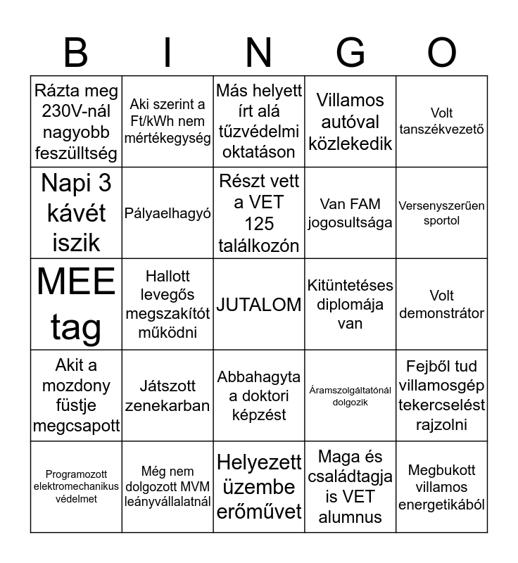 This bingo card has a free space and 24 words: Játszott zenekarban, Még nem dolgozott MVM leányvállalatnál, Részt vett a VET 125 találkozón, Programozott elektromechanikus védelmet, Volt tanszékvezető, Rázta meg 230V-nál nagyobb feszülltség, Napi 3 kávét iszik, Aki szerint a Ft/kWh nem mértékegység, Kitüntetéses diplomája van, Abbahagyta a doktori képzést, Van FAM jogosultsága, MEE tag, Áramszolgáltatónál dolgozik, Fejből tud villamosgép tekercselést rajzolni, Pályaelhagyó, Maga és családtagja is VET alumnus, Volt demonstrátor, Más helyett írt alá tűzvédelmi oktatáson, Versenyszerűen sportol, Hallott levegős megszakítót működni, Megbukott villamos energetikából, Akit a mozdony füstje megcsapott, Villamos autóval közlekedik and Helyezett üzembe erőművet.