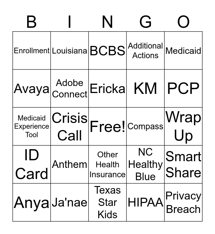 This bingo card has a free space and 24 words: Anthem, Ja'nae, Ericka, Anya, Medicaid, Enrollment, Avaya, Louisiana, Compass, Other Health Insurance, KM, Medicaid Experience Tool, NC Healthy Blue, Smart Share, Adobe Connect, HIPAA, Wrap Up, BCBS, PCP, Crisis Call, Privacy Breach, ID Card, Additional Actions and Texas Star Kids.