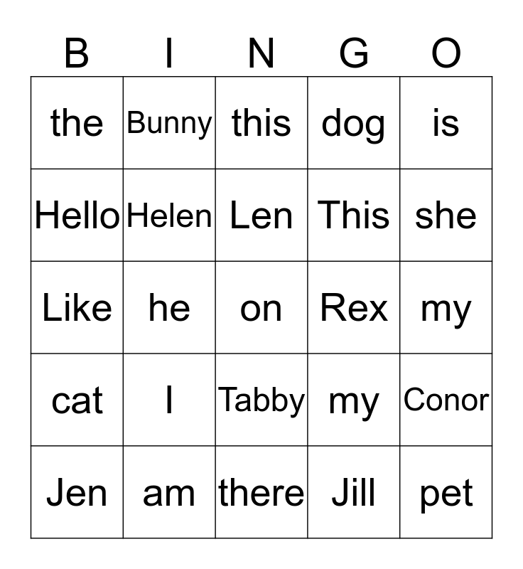This bingo card has a free space and 24 words: I, am, Len, Jen, is, the, Hello, Bunny, Rex, Tabby, This, Like, my, Conor, Helen, Jill, my, this, she, he, pet, cat, dog and there.