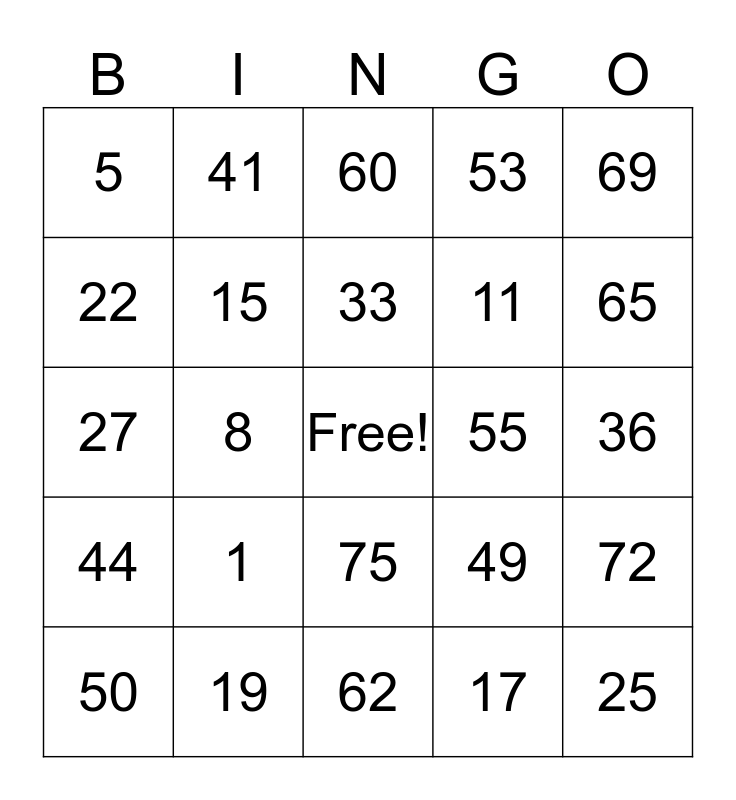 This bingo card has a free space and 24 words: 1, 19, 33, 50, 69, 5, 22, 41, 55, 75, 11, 27, 49, 72, 15, 17, 36, 60, 65, 8, 25, 44, 53 and 62.