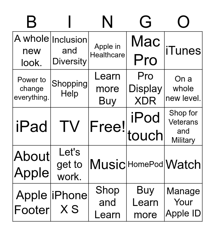 This bingo card has a free space and 95 words: iPhone XR from $19.99/mo. or $479., Two great ways to buy. Just trade in your current iPhone online or at an Apple Store.*, Buy Learn more, iPhone X R, All-screen design. Longest battery life ever in an iPhone., Fastest performance. Studio-quality photos., Learn more Buy, iPhone X S, Largest Super Retina display. Fastest performance with A12 Bionic. Most secure facial authentication with Face ID., Breakthrough dual cameras with Depth Control., Learn more Buy, Apple Watch Series 4, More powerful, more colorful., Learn more Buy, iOS 13, A whole new look., On a whole new level., See the preview, iPadOS, What's in a name? Quite a bit, actually., See the preview, macOS Catalina, The power of Mac. Taken further., See the preview, Mac Pro, Power to change everything., Learn more Notify me, Pro Display XDR, Believing is seeing., Learn more Notify me, Let's get to work., Discover how Apple can help, your business grow., Learn more, Apple Footer, * iPhone XR pricing is after trade‑in of iPhone 7 Plus in good condition. Monthly pricing requires a 24‑month installment loan with a 0% APR, and iPhone activation. Applicable sales tax and fees due at time of purchase. Last payment may be less d, Shop and Learn, Mac, iPad, iPhone, Watch, TV, Music, iTunes, HomePod, iPod touch, Apple Card, Accessories, Gift Cards, Apple Store, Find a Store, Genius Bar, Today at Apple, Apple Camp, Field Trip, Apple Store App, Refurbished and Clearance, Financing, Apple Trade In, Order Status, Shopping Help, For Education, Apple and Education, Shop for College, For Business, Apple and Business, Shop for Business, For Healthcare, Apple in Healthcare, Health on Apple Watch, Health Records on iPhone, Account, Manage Your Apple ID, Apple Store Account, iCloud.com, Apple Values, Accessibility, Education, Environment, Inclusion and Diversity, Privacy, Supplier Responsibility, For Government, Shop for Government, Shop for Veterans and Military, About Apple, Newsroom, Apple Leadership, Job Opportunities, Investors, Events, Contact Apple, More ways to shop: Find an Apple Store or other retailer near you. Or call 1-800-MY-APPLE., United States and Copyright © 2019 Apple Inc. All rights reserved.Privacy Policy Terms of Use Sales and Refunds Legal Site Map.