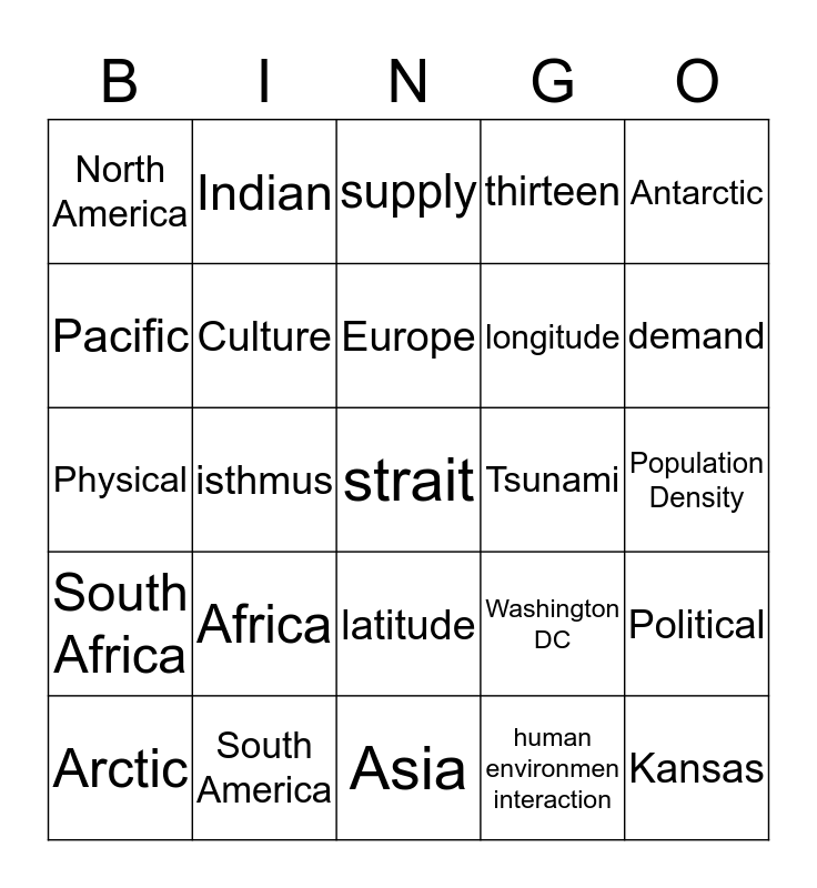 This bingo card has 25 words: Africa, Asia, Europe, Arctic, Antarctic, North America, Pacific, Indian, Tsunami, latitude, longitude, Physical, Washington DC, Political, Culture, Kansas, Population Density, supply, demand, isthmus, strait, South America, South Africa, thirteen and human environmen interaction.