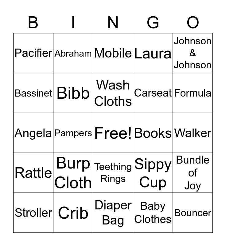 This bingo card has a free space and 29 words: Stroller, Wipes, Pampers, Bottle, Pacifier, Mobile, Bibb, Burp Cloth, Books, Crib, Walker, Bouncer, Diaper Bag, Baby Clothes, Formula, Breast Pump, Teething Rings, Rattle, Johnson & Johnson, Angela, Sippy Cup, Humidifier, Carseat, Bassinet, Laura, Abraham, Bundle of Joy, Wash Cloths and Onezie.