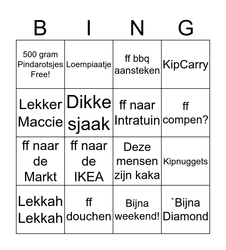 This bingo card has 16 words: Lekkah Lekkah, ff douchen, ff bbq aansteken, KipCarry, Lekker Maccie, Loempiaatje, Deze mensen zijn kaka, Kipnuggets, 500 gram Pindarotsjes Free!, Dikke sjaak, Bijna weekend!, ff compen?, ff naar de Markt, ff naar de IKEA, ff naar Intratuin and `Bijna Diamond.