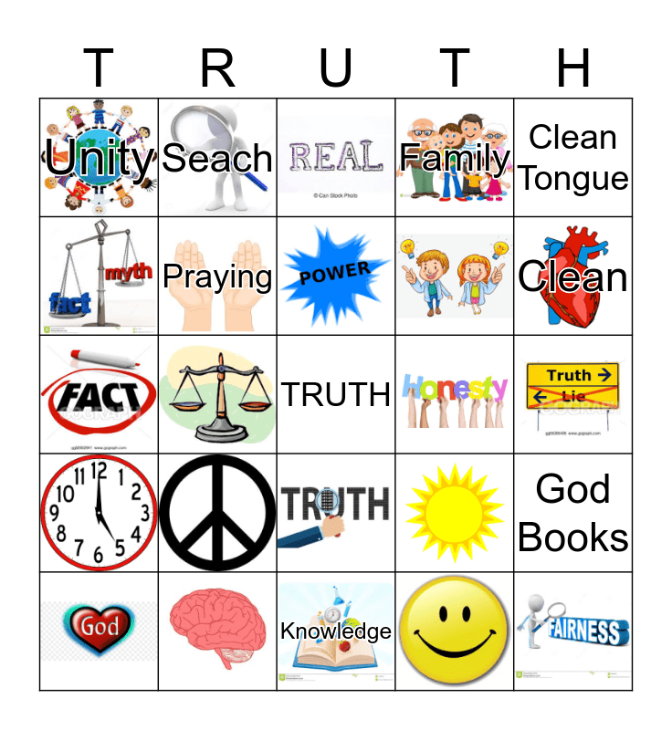 This bingo card has 26 images, a free space and 9 words: Day of Judgment, Unity, Praying, Knowledge, Clean, Clean Tongue, Family, Seach and God Books.