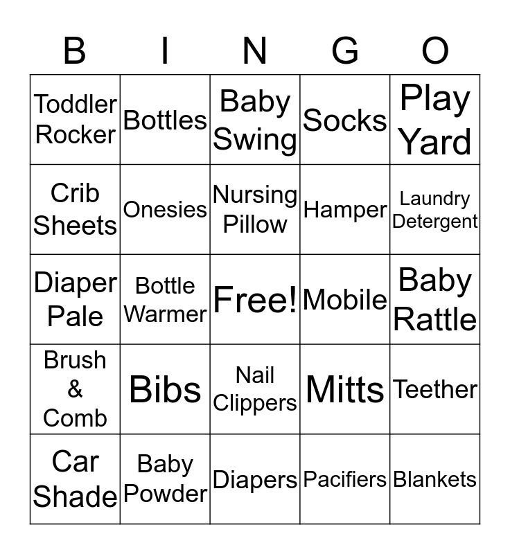 This bingo card has a free space and 49 words: Sleepers, Blankets, Gift Certificate, Diapers, Bibs, Tub, Bottles, Towels, Crib Sheets, Bottle Rack, Onesies, Socks, Teether, Mitts, Pack 'n Play, Music Box, Nursing Pillow, Mobile, Car Seat, Play Yard, Bottle Warmer, Pacifiers, Toddler Rocker, Hamper, Crib, Laundry Detergent, Car Shade, Burp Cloths, Nail Clippers, Brush & Comb, Carrier Backpack, Baby bowls, Baby Lotion, Baby Wash, Baby Powder, Baby Wipes, Baby Wipe Warmer, High Chair, Baby Rattle, Changing Pad, Baby Water Mat, Baby Pool, Night Light, Stuffed Animals, Diaper Pale, Baby Swing, Bouncer, Monitor and Stroller.