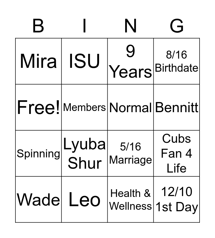 This bingo card has 16 words: Leo, Cubs Fan 4 Life, 9 Years, Mira, Spinning, ISU, 5/16 Marriage, Health & Wellness, Free!, Members, Wade, 8/16 Birthdate, Lyuba Shur, Bennitt, Normal and 12/10 1st Day.