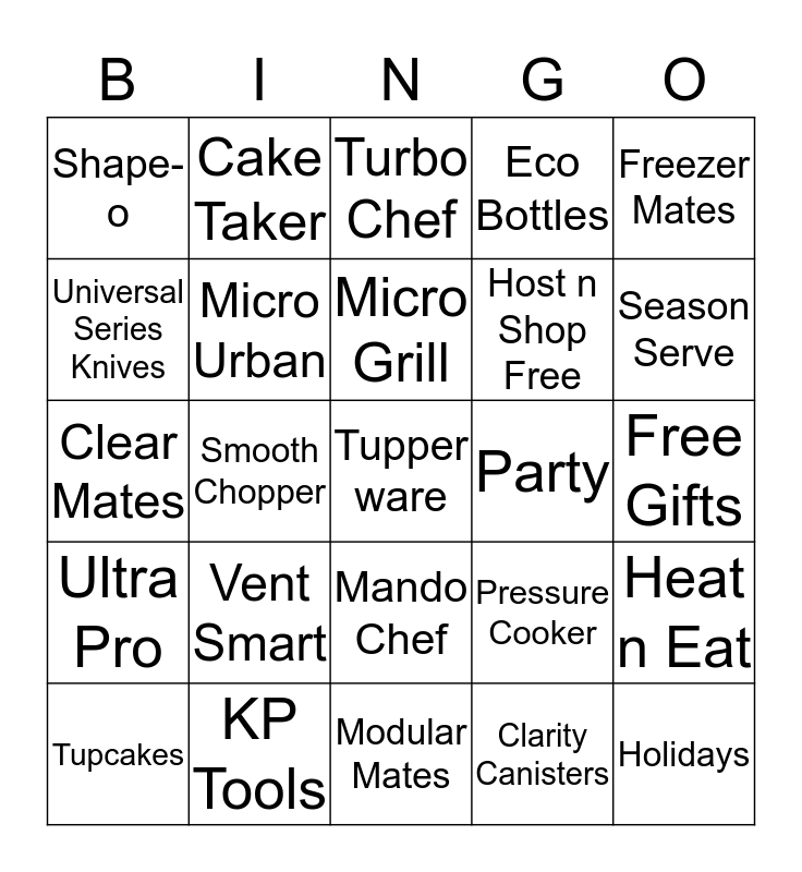 This bingo card has a free space and 24 words: Vent Smart, KP Tools, Micro Grill, Tupcakes, Freezer Mates, Shape-o, Universal Series Knives, Cake Taker, Party, Mando Chef, Host n Shop Free, Clear Mates, Pressure Cooker, Heat n Eat, Micro Urban, Clarity Canisters, Free Gifts, Turbo Chef, Season Serve, Smooth Chopper, Holidays, Ultra Pro, Eco Bottles and Modular Mates.