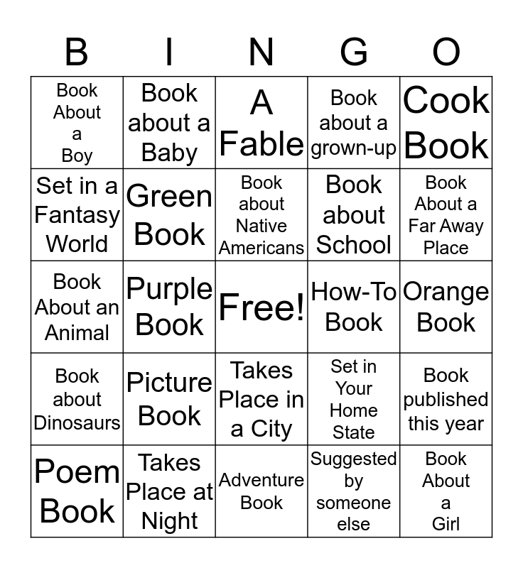 This bingo card has a free space and 29 words: Poem Book, Historical Book, Purple Book, Book About a Person Your Age, Book About a Boy, A Fable, Green Book, Picture Book, How-To Book, Takes Place at Night, Orange Book, Book About a Girl, Adventure Book, Suggested by someone else, Book About a Far Away Place, Award Winning Book, Takes Place in a City, Book about Dinosaurs, Cook Book, Book About an Animal, Set in Your Home State, Book with a TV Show, Book about School, Set in a Fantasy World, Book about a grown-up, Book about a Baby, Book published this year, Book about Native Americans and Re-Told Fairy Tale.