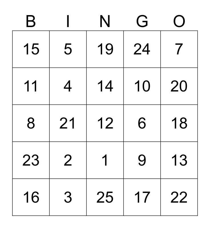 This bingo card has a free space and 24 words: 2, 3, 14, 16, 7, 15, 11, 5, 6, 1, 10, 8, 9, 13, 4, 17, 18, 19, 20, 21, 22, 23, 24 and 25.