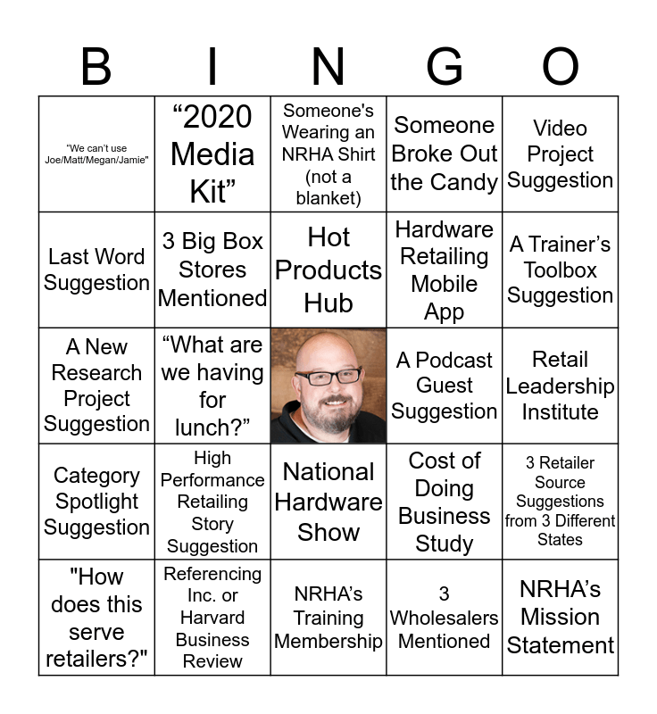 This bingo card has a free space and 24 words: "How does this serve retailers?", High Performance Retailing Story Suggestion, Hot Products Hub, 3 Wholesalers Mentioned, Video Project Suggestion, “We can’t use Joe/Matt/Megan/Jamie", “2020 Media Kit”, Someone's Wearing an NRHA Shirt (not a blanket), A Podcast Guest Suggestion, Retail Leadership Institute, A New Research Project Suggestion, 3 Big Box Stores Mentioned, Cost of Doing Business Study, 3 Retailer Source Suggestions from 3 Different States, Last Word Suggestion, Referencing Inc. or Harvard Business Review, NRHA’s Training Membership, Someone Broke Out the Candy, A Trainer’s Toolbox Suggestion, Category Spotlight Suggestion, “What are we having for lunch?”, National Hardware Show, Hardware Retailing Mobile App and NRHA’s Mission Statement.