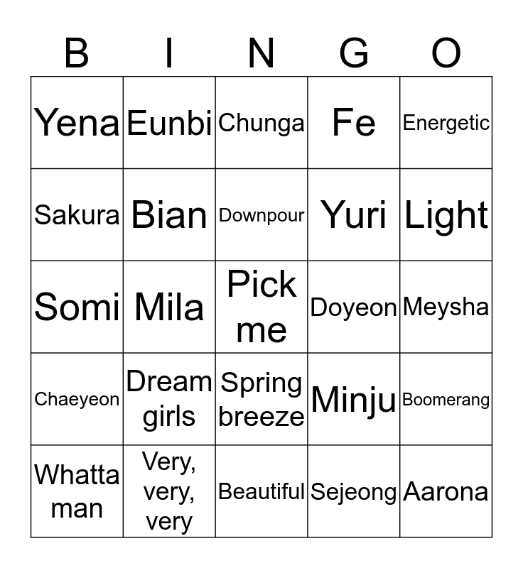 This bingo card has a free space and 24 words: Dream girls, Very, very, very, Downpour, Whatta man, Energetic, Yena, Sakura, Eunbi, Doyeon, Spring breeze, Yuri, Somi, Minju, Boomerang, Bian, Sejeong, Meysha, Chunga, Light, Mila, Aarona, Chaeyeon, Fe and Beautiful.