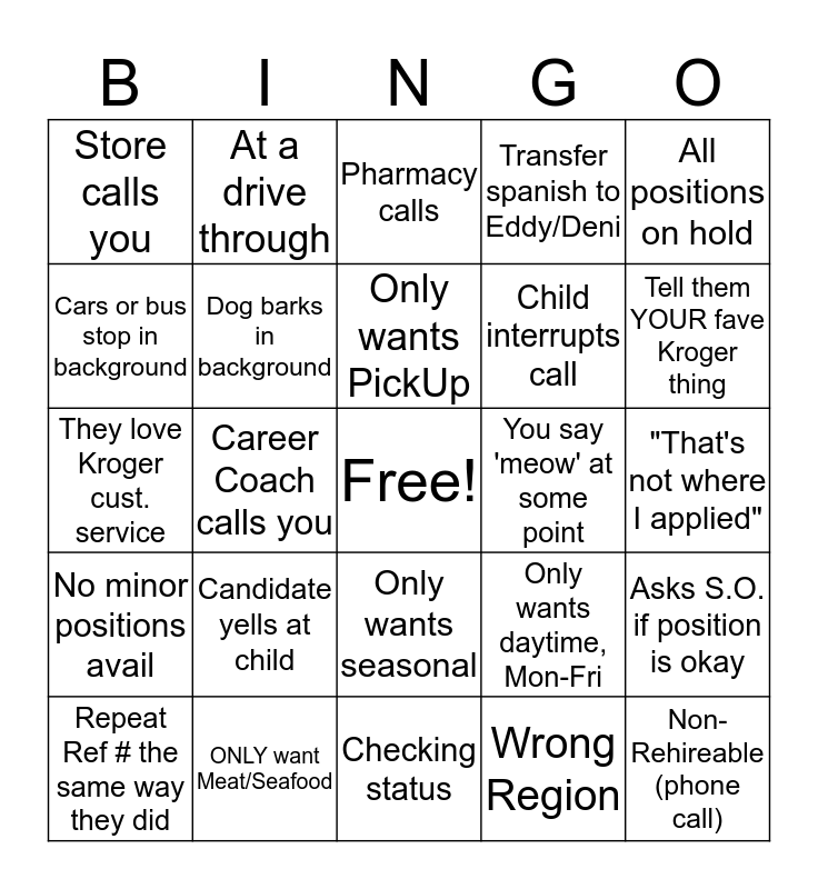 This bingo card has a free space and 29 words: Repeat Ref # the same way they did, Minor has mom on the phome, Career Coach calls you, You get put on hold by candidate, Store calls you, Pharmacy calls, Dog barks in background, Candidate yells at child, You say 'meow' at some point, ONLY want Meat/Seafood, "That's not where I applied", Non-Rehireable (phone call), Checking status, Wrong Region, Tell them YOUR fave Kroger thing, Translator (foreign or sign language), Only wants seasonal, No minor positions avail, All positions on hold, They love Kroger cust. service, Only wants daytime, Mon-Fri, Can't do OVN (on phone), Child interrupts call, Cars or bus stop in background, Transfer spanish to Eddy/Deni, At a drive through, Asks S.O. if position is okay, Only wants PickUp and Asks you to repeat question.