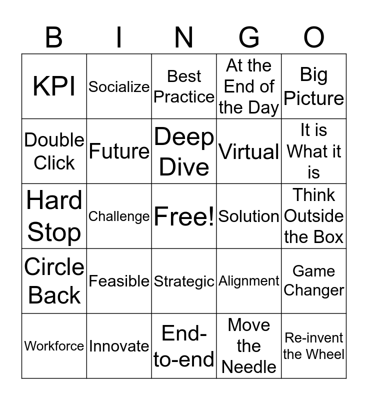 This bingo card has a free space and 24 words: Feasible, Innovate, Deep Dive, Workforce, Big Picture, KPI, Double Click, Socialize, Solution, Strategic, Virtual, Hard Stop, Alignment, Game Changer, Future, Move the Needle, Think Outside the Box, Best Practice, It is What it is, Challenge, Re-invent the Wheel, Circle Back, At the End of the Day and End-to-end.