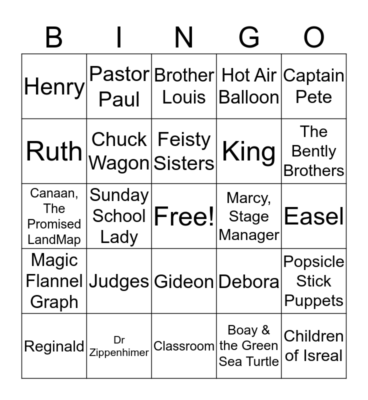 This bingo card has a free space and 33 words: Buck Denver, Clive & Ian, Sunday School Lady, Phil, Magic Flannel Graph, Chuck Wagon, Captain Pete, Reginald, Pastor Paul, Micheal, Feisty Sisters, Brother Louis, Chester Wigget, Guitar, Marcy, Stage Manager, The Bently Brothers, Dr Zippenhimer, Canaan, The Promised LandMap, Judges, Debora, Gideon, Samson, Henry, Easel, Classroom, Children of Isreal, Hot Air Balloon, King, Ruth, Popsicle Stick Puppets, Wheat Field, Boay & the Green Sea Turtle and Cowboy Hat.