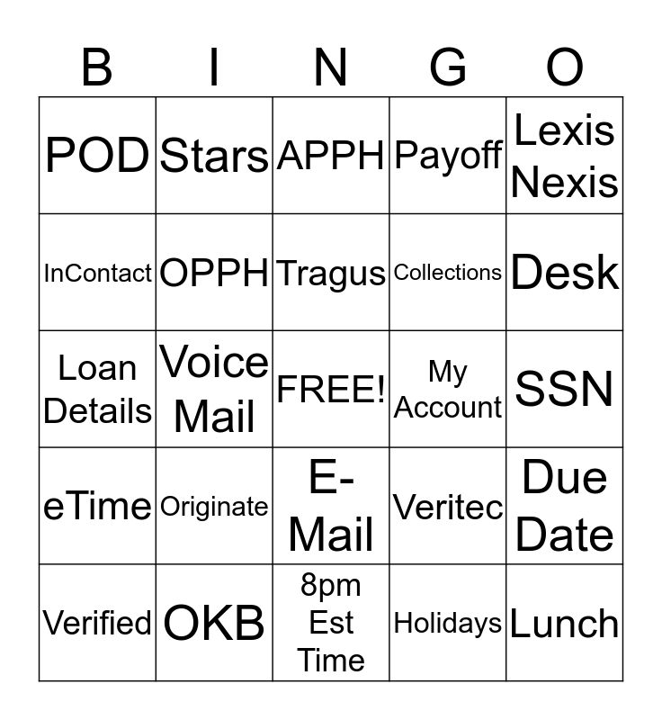 This bingo card has a free space and 24 words: Originate, OKB, Tragus, Verified, Lexis Nexis, POD, InContact, Stars, My Account, E-Mail, Collections, Loan Details, Veritec, Due Date, OPPH, Holidays, SSN, APPH, Desk, Voice Mail, Lunch, eTime, Payoff and 8pm Est Time.