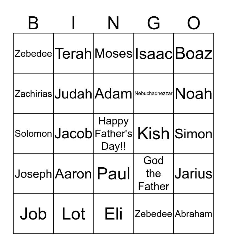 This bingo card has a free space and 24 words: Aaron, Lot, Adam, Job, Boaz, Zebedee, Zachirias, Terah, Kish, Paul, Nebuchadnezzar, Solomon, God the Father, Jarius, Judah, Zebedee, Simon, Moses, Noah, Jacob, Abraham, Joseph, Isaac and Eli.