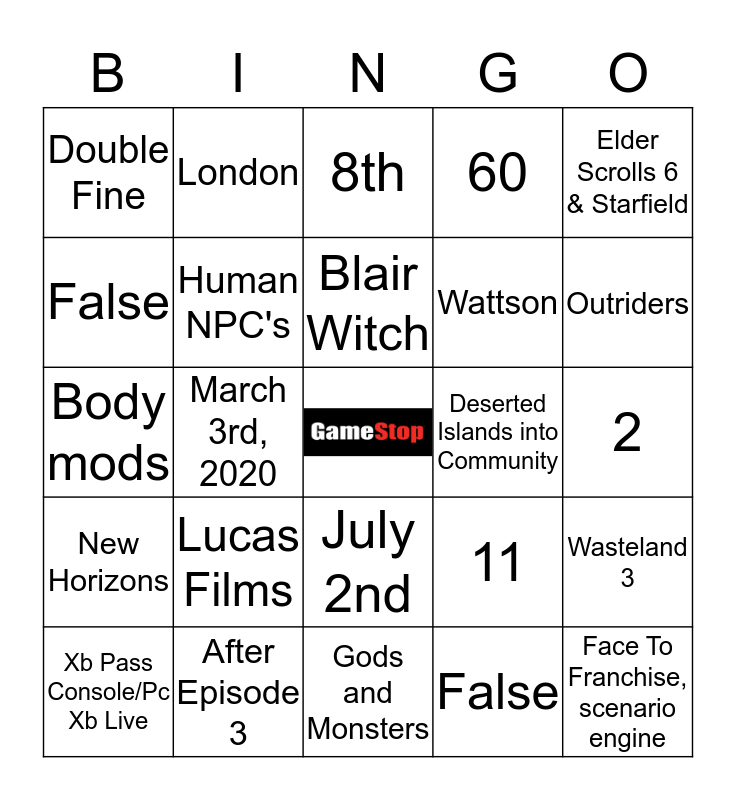 This bingo card has a free space and 24 words: Lucas Films, After Episode 3, Blair Witch, Xb Pass Console/Pc Xb Live, Elder Scrolls 6 & Starfield, Double Fine, False, London, Deserted Islands into Community, July 2nd, Wattson, Body mods, 11, Wasteland 3, Human NPC's, False, 2, 8th, Outriders, March 3rd, 2020, Face To Franchise, scenario engine, New Horizons, 60 and Gods and Monsters.