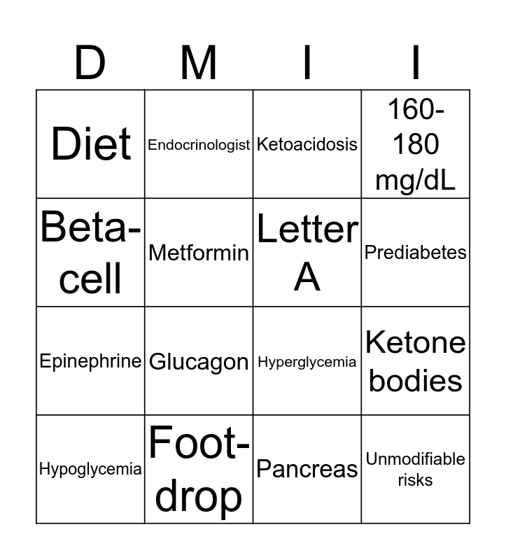 This bingo card has 16 words: Foot-drop, Ketone bodies, Ketoacidosis, Diet, Epinephrine, Endocrinologist, Hyperglycemia, Pancreas, Beta-cell, Metformin, Hypoglycemia, 160-180 mg/dL, Glucagon, Prediabetes, Letter A and Unmodifiable risks.