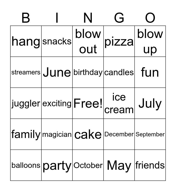 This bingo card has a free space and 24 words: magician, party, birthday, balloons, blow up, hang, streamers, snacks, ice cream, cake, candles, juggler, December, September, June, May, July, blow out, fun, exciting, friends, family, pizza and October.