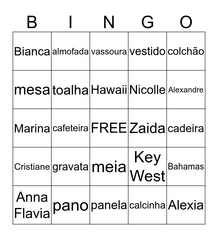 This bingo card has a free space and 39 words: Cabo Frio, sutiã, Heloisa, toalha, Anna Flavia, meia, Hawaii, Catia, colchão, Cristiane, cafeteira, vestido, Alexia, cadeira, Zaida, gravata, tapete, Bianca, Cadeira, Key West, mesa, panela, Nicolle, Alexandre, roupa de cama, sofa, mesa de cafe, papel toalha, cortina, almofada, espelho, flor, vassoura, pano, calcinha, Paria, Bahamas, Marina and cueca.