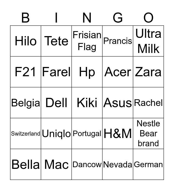 This bingo card has 25 words: Uniqlo, Dancow, Hp, Bella, Ultra Milk, Hilo, F21, Tete, Asus, Portugal, Acer, Belgia, H&M, Nestle Bear brand, Farel, German, Rachel, Frisian Flag, Zara, Dell, Kiki, Mac, Switzerland, Prancis and Nevada.