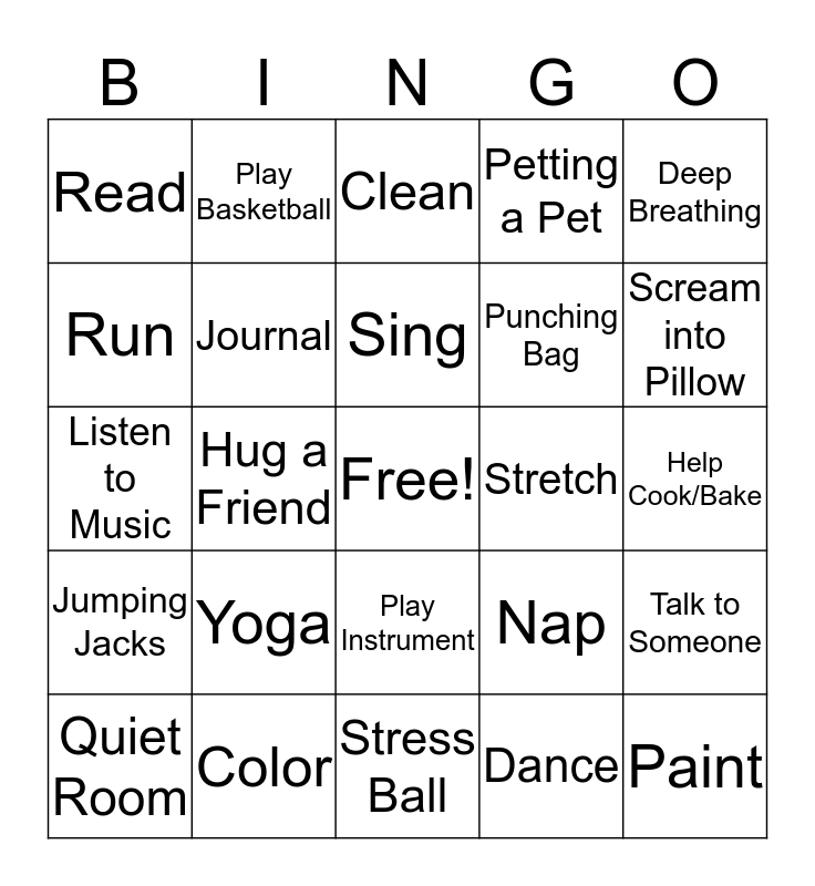 This bingo card has a free space and 24 words: Yoga, Color, Sing, Quiet Room, Deep Breathing, Read, Run, Play Basketball, Stretch, Play Instrument, Punching Bag, Listen to Music, Nap, Talk to Someone, Journal, Dance, Help Cook/Bake, Clean, Scream into Pillow, Hug a Friend, Paint, Jumping Jacks, Petting a Pet and Stress Ball.