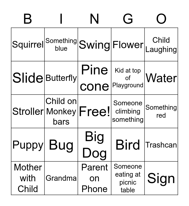 This bingo card has a free space and 24 words: Bug, Grandma, Pine cone, Mother with Child, Child Laughing, Squirrel, Slide, Something blue, Someone climbing something, Big Dog, Kid at top of Playground, Stroller, Bird, Trashcan, Butterfly, Someone eating at picnic table, Something red, Swing, Water, Child on Monkey bars, Sign, Puppy, Flower and Parent on Phone.