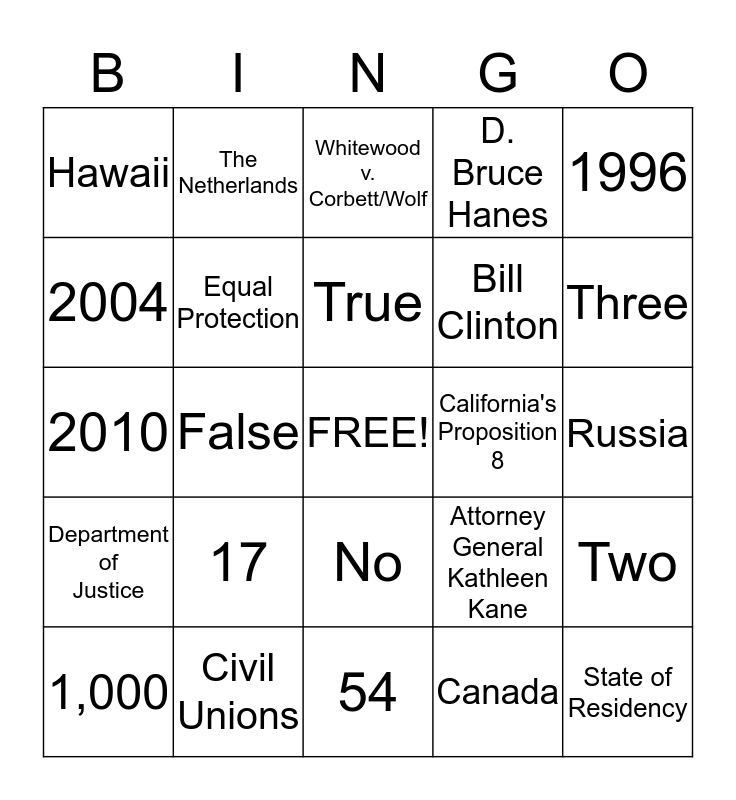 This bingo card has a free space and 24 words: 17, Civil Unions, True, 1,000, 1996, Hawaii, 2004, The Netherlands, California's Proposition 8, No, Bill Clinton, 2010, Attorney General Kathleen Kane, Two, Equal Protection, Canada, Russia, Whitewood v. Corbett/Wolf, Three, False, State of Residency, Department of Justice, D. Bruce Hanes and 54.