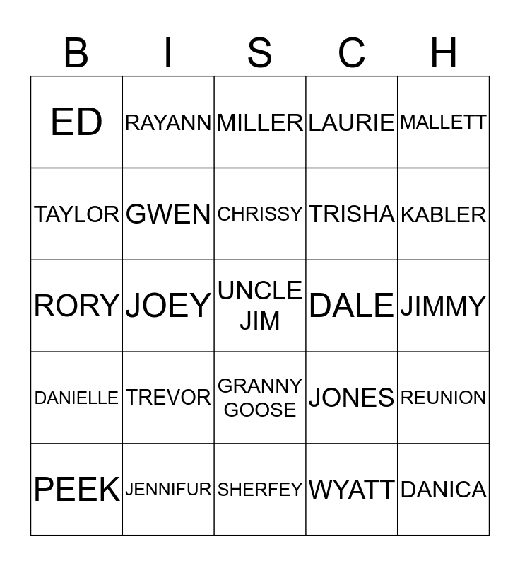 This bingo card has a free space and 24 words: TREVOR, JENNIFUR, CHRISSY, PEEK, MALLETT, ED, TAYLOR, RAYANN, DALE, GRANNY GOOSE, TRISHA, RORY, JONES, REUNION, GWEN, WYATT, JIMMY, MILLER, KABLER, JOEY, DANICA, DANIELLE, LAURIE and SHERFEY.